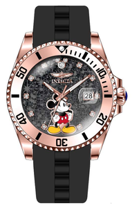 INVICTA Disney Limited Edition Lady 38mm Stainless Steel Rose Gold Black dial PC32 Quartz , Band Material: Silicone, Band Tone: Black, Band Size [mm]: 20, Band Length [mm]: 200, Buckle Type: Buckle , Crown Type : Push, Case Material : Stainless Steel, Case Tone : Rose Gold, Case Size (mm) : 38, Case Back : Solid, Material of Hands : Metal, Color of Hands : White,Rose Gold, Crystal Type : Flame Fusion, Bezel Material : Stainless Steel, Dial Material : Glitter, Dial Color : Black .Purchasing these parts and having a non-authorized repair center open your watch voids all manufacturing warranties. Invicta cannot guarantee the quality standards of an altered timepiece, the standard 3-year limited warranty on Invicta timepieces shall be invalid if the timepiece is serviced at any time by an unauthorized repair center. This includes battery replacements, which must be done at an Invicta authorized repair center in order to maintain the eligibility of the warranty. Please follow the link below to learn more about Invicta's warranty.https://cdn.invictawatch.com/www/files/invicta-warranty-2018.pdf