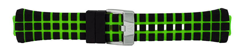 Band Material: Silicone, Band Tone: Black and Green Grid, Band Size: 17 mm, Band Length: 196mm, Clasp Type: Buckle, Clasp Tone: Stainless Steel Please note that bands do not ship with spring bars or T bars. If you need these parts, please add them to your cart with the corresponding part sku.