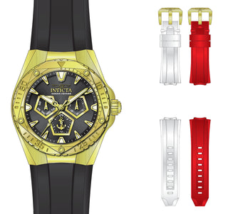 Band Material: Silicone, Band Tone: Black,White,Red, Band Width: 29.1MM, Band Length: 200MM, Crown Type: Push, Case Material: Stainless Steel, Case Tone: Gold, Case Size [mm]: 45.00, Case Back: Solid screwed, Material of Hands: Metal, Color of Hands: Gold,Luminous, Crystal Type: Mineral, Bezel Material: Stainless Steel, Dial Material: Metal, Dial Color: Black,Gold, Dial Pattern: Sun-ray Finish .Purchasing these parts and having a non-authorized repair center open your watch voids all manufacturing warranties. Invicta cannot guarantee the quality standards of an altered timepiece, the standard 3-year limited warranty on Invicta timepieces shall be invalid if the timepiece is serviced at any time by an unauthorized repair center. This includes battery replacements, which must be done at an Invicta authorized repair center in order to maintain the eligibility of the warranty. Please follow the link below to learn more about Invicta's warranty.https://cdn.invictawatch.com/www/files/invicta-warranty-2018.pdf