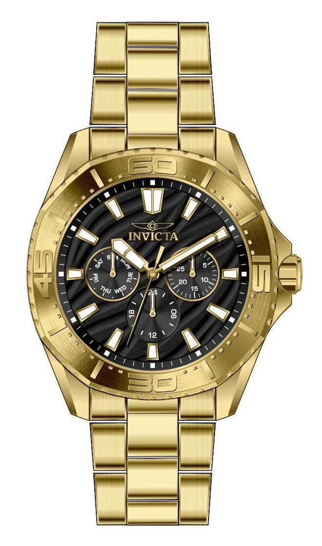 Band Material: Stainless Steel, Band Tone: Gold, Band Width: 22MM, Band Length: 180MM, Crown Type: Push, Case Material: Stainless Steel, Case Tone: Gold, Case Size [mm]: 43.5, Case Back: Solid, Material of Hands: Brass, Color of Hands: Gold,Luminous, Crystal Type: Mineral, Bezel Material: None, Dial Material: Brass, Dial Color: Black, Dial Pattern: Embossed pattern .Purchasing these parts and having a non-authorized repair center open your watch voids all manufacturing warranties. Invicta cannot guarantee the quality standards of an altered timepiece, the standard 3-year limited warranty on Invicta timepieces shall be invalid if the timepiece is serviced at any time by an unauthorized repair center. This includes battery replacements, which must be done at an Invicta authorized repair center in order to maintain the eligibility of the warranty. Please follow the link below to learn more about Invicta's warranty.https://cdn.invictawatch.com/www/files/invicta-warranty-2018.pdf