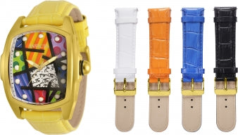 Band Material: Leather, Band Tone: Yellow, White, Blue, and Black Band Width: 16MM, Band Length: 190MM, Buckle Type: Buckle, Please note that bands do not ship with spring bars or T bars. If you need these parts, please add them to your cart with the corresponding part sku.