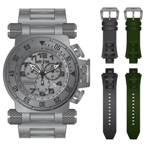 Band Material: Titanium,Silicone, Band Tone: Black,Titanium,Green, Band Size [mm]: 34.5, Band Length [mm]: 210, Buckle Type: Fold over safety . Please note that bands do not ship with spring bars or T bars. If you need these parts, please add them to your cart with the corresponding part sku.