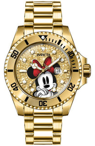 INVICTA Disney Limited Edition Lady 36mm Stainless Steel Gold Gold dial PC22A Quartz , Band Material: Stainless Steel, Band Tone: Gold, Band Size [mm]: 17, Band Length [mm]: 175, Buckle Type: Fold over safety , Crown Type : Push, Case Material : Stainless Steel, Case Tone : Gold, Case Size (mm) : 36, Case Back : Solid, Material of Hands : Metal, Color of Hands : White,Gold, Crystal Type : Flame Fusion, Bezel Material : Stainless Steel,Aluminum, Dial Material : Glitter, Dial Color : Gold .Purchasing these parts and having a non-authorized repair center open your watch voids all manufacturing warranties. Invicta cannot guarantee the quality standards of an altered timepiece, the standard 3-year limited warranty on Invicta timepieces shall be invalid if the timepiece is serviced at any time by an unauthorized repair center. This includes battery replacements, which must be done at an Invicta authorized repair center in order to maintain the eligibility of the warranty. Please follow the link below to learn more about Invicta's warranty.https://cdn.invictawatch.com/www/files/invicta-warranty-2018.pdf