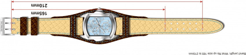 Band For Lady Invicta Lupah 12263, Band Material Leather, Band Color Tan, Brown, Band Width 20 MM, Band Length 210 MM, Buckle Type Regular, Clasp Type Regular. Please note that bands do not ship with spring bars or T bars. If you need these parts, please add them to your cart with the corresponding part sku.