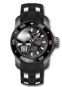 Band Material: Silicone, Stainless Steel, Band Tone: Black, Steel, Band Width: 26MM, Band Length: 210MM, Crown Type: Push, Case Material: Stainless Steel, Case Tone: Gunmetal, Case Size [mm]: 48, Color of Hands: Silver, White, Crystal Type: Flame Fusion, Bezel Material: Stainless Steel, Dial Material: Metal, Dial Color: Gunmetal, White .Purchasing these parts and having a non-authorized repair center open your watch voids all manufacturing warranties. Invicta cannot guarantee the quality standards of an altered timepiece, the standard 3-year limited warranty on Invicta timepieces shall be invalid if the timepiece is serviced at any time by an unauthorized repair center. This includes battery replacements, which must be done at an Invicta authorized repair center in order to maintain the eligibility of the warranty. Please follow the link below to learn more about Invicta's warranty.https://cdn.invictawatch.com/www/files/invicta-warranty-2018.pdf