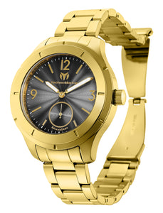 , Crown Type Push, Case Material Stainless Steel, Case Tone Gold, Case Size (mm) 42, Case Back Solid, Material of Hands Metal, Color of Hands Gold, Crystal Type Flame Fusion, Bezel Material Stainless Steel, Dial Material Metal, Dial Color Charcoal, Dial Pattern Textured