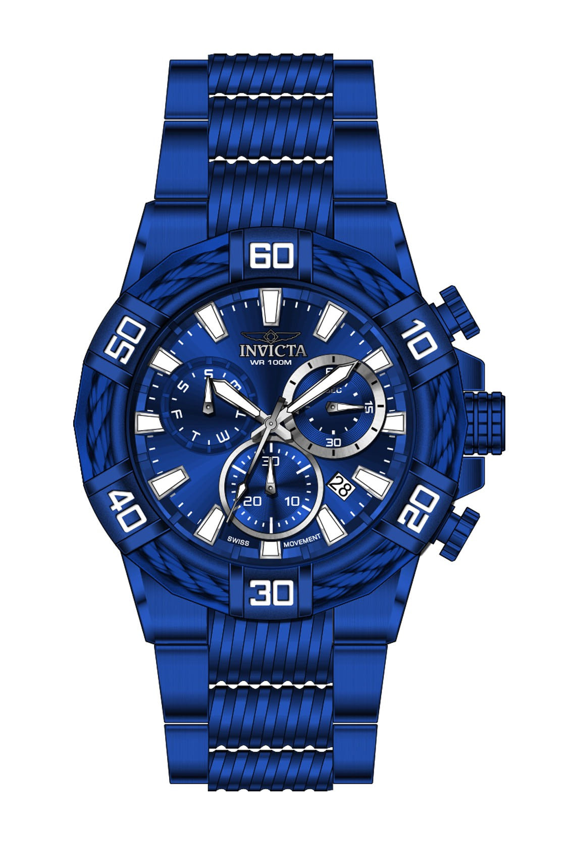 INVICTA Bolt Men 51mm Stainless Steel Blue Blue dial Z60 Quartz , Band Material: Stainless Steel, Band Tone: Blue, Band Size [mm]: 30, Band Length [mm]: 190, Buckle Type: Fold over safety , Crown Type : Push, Case Material : Stainless Steel, Case Tone : Blue, Case Size (mm) : 51, Case Back : Solid, Material of Hands : Metal, Color of Hands : Silver, Crystal Type : Flame Fusion, Bezel Material : Stainless Steel,Cable, Dial Material : Metal, Dial Color : Blue, Dial Pattern : Sun-ray Finish .Purchasing these parts and having a non-authorized repair center open your watch voids all manufacturing warranties. Invicta cannot guarantee the quality standards of an altered timepiece, the standard 3-year limited warranty on Invicta timepieces shall be invalid if the timepiece is serviced at any time by an unauthorized repair center. This includes battery replacements, which must be done at an Invicta authorized repair center in order to maintain the eligibility of the warranty. Please follow the link below to learn more about Invicta's warranty.https://cdn.invictawatch.com/www/files/invicta-warranty-2018.pdf